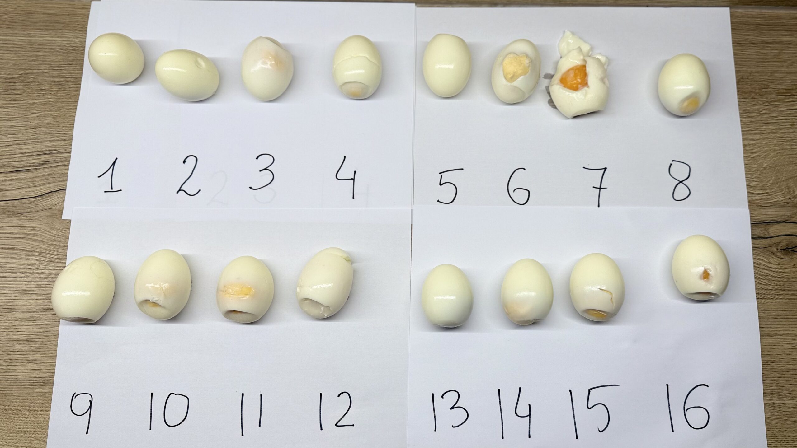 Jajka różnią się twardością, mamy takie które są niedogotowane jak nr 7, przez wydające się być prawidłowo ścięte po mocno zestalone jak nr 2 czy 13 (to ciężko oddać zdjęciem, więc musicie nam uwierzyć na słowo). Ostateczna ocena wykreowanej zmienności w stopniu ścięcia odbędzie po ich rozcięciu i ocenie jakości żółtka.