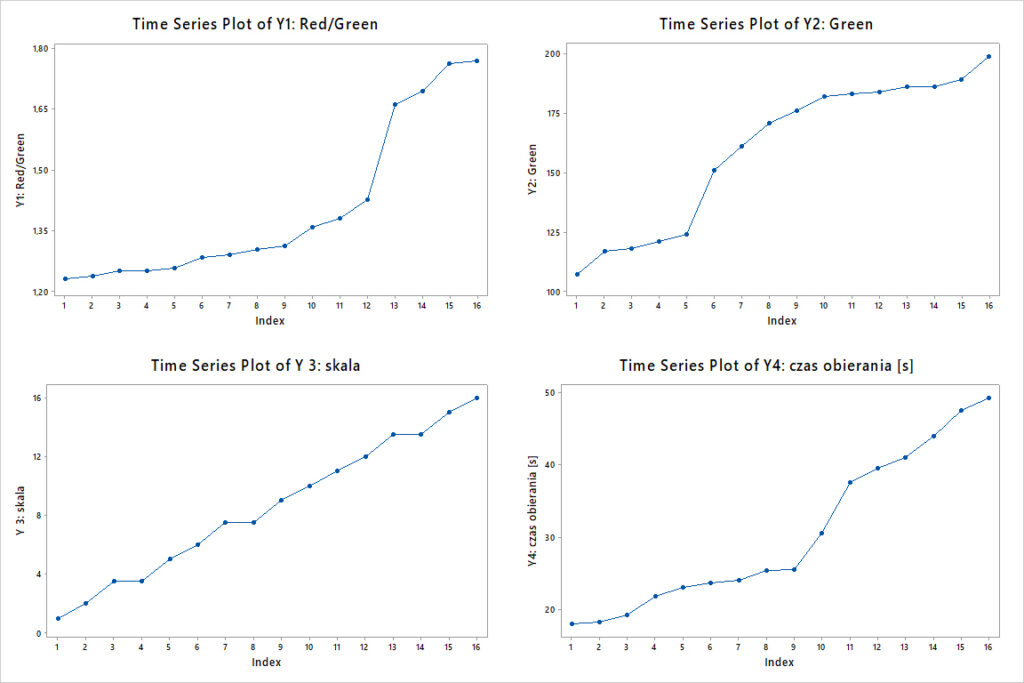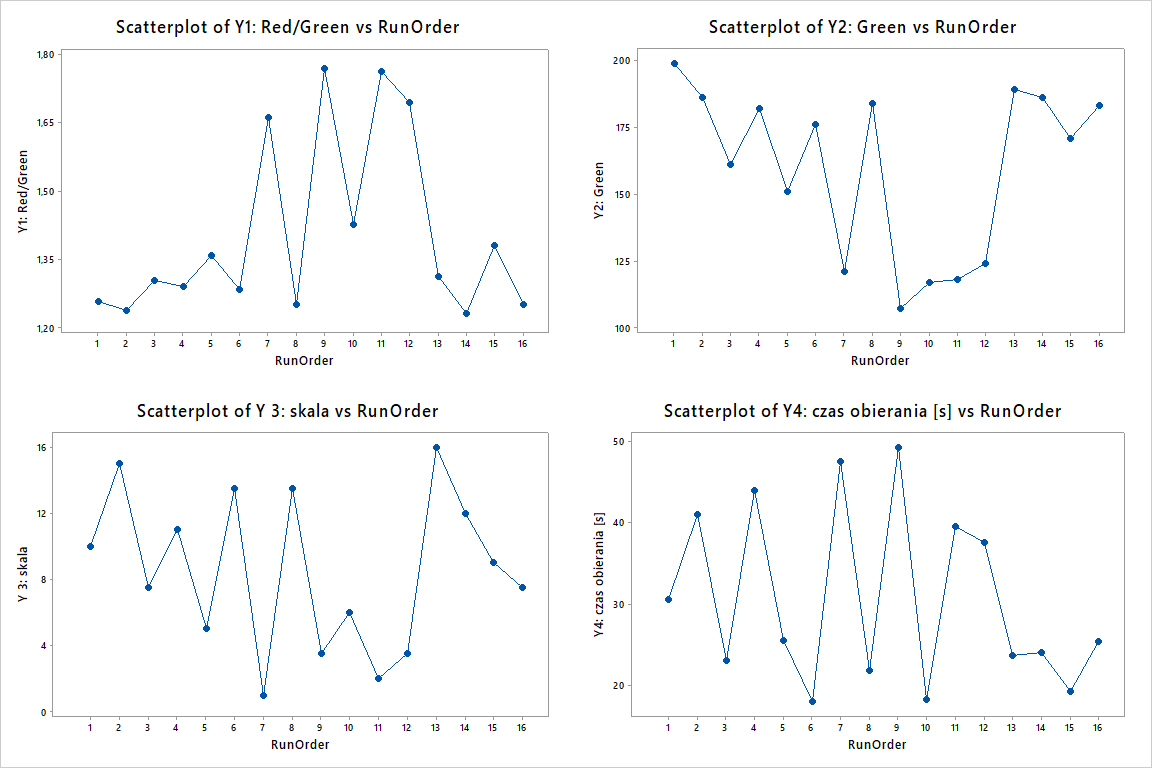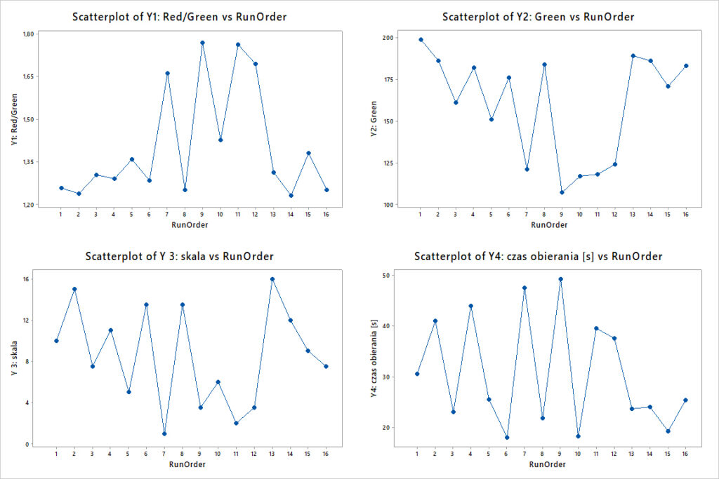 Na tym wykresie chcemy zobaczyć brak zależności wyników doe od czasu jego przeprowadzenia. Każda zależność Y od kolejności przebiegów doe powinna nas zatrzymać. O ile nie możemy tego braku losowości wytłumaczyć brakiem losowości w przeprowadzeniu eksperymentu, oznacza to że zmienność w doe została wykreowana przez „coś” co zmieniało się jego trakcie. W przypadku gotowania jajek ciężko sobie wyobrazić co to by mogło być. Klasycznymi przykładami z życia są zużycia narzędzi, rosnąca temperatura otoczenia czy wilgotność powietrza, zmiany narzędzi itd. Jeżeli mamy taką sytuację, to późniejsza analiza doe, która polega na przypisaniu poszczególnym efektom głównym i interakcjom odpowiedzialność za zmienność nie sensu – z prostego powodu, nie one ją wykreowały.