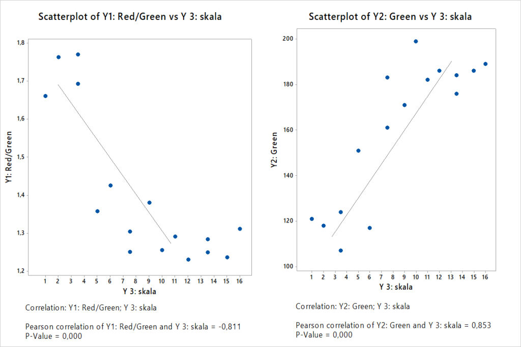 Y1: Red/ Green jest skorelowany negatywnie z Y3: skala, oznacza to, że te same czynniki będą wpływały na oba Yki w odwrotny sposób. Im wyższy Y1 tym niższe pozycja w skali (żółtko bardziej pomarańczowe). Y2: Green jest natomiast pozytywnie skorelowany z Y3: skala. Im więcej kanału zielonego tym bardziej przesuszone żółtko – wyższa pozycja w skali. Oznacza to, że takie same czynniki będą wpływały na oba te Yki w taki sam sposób.