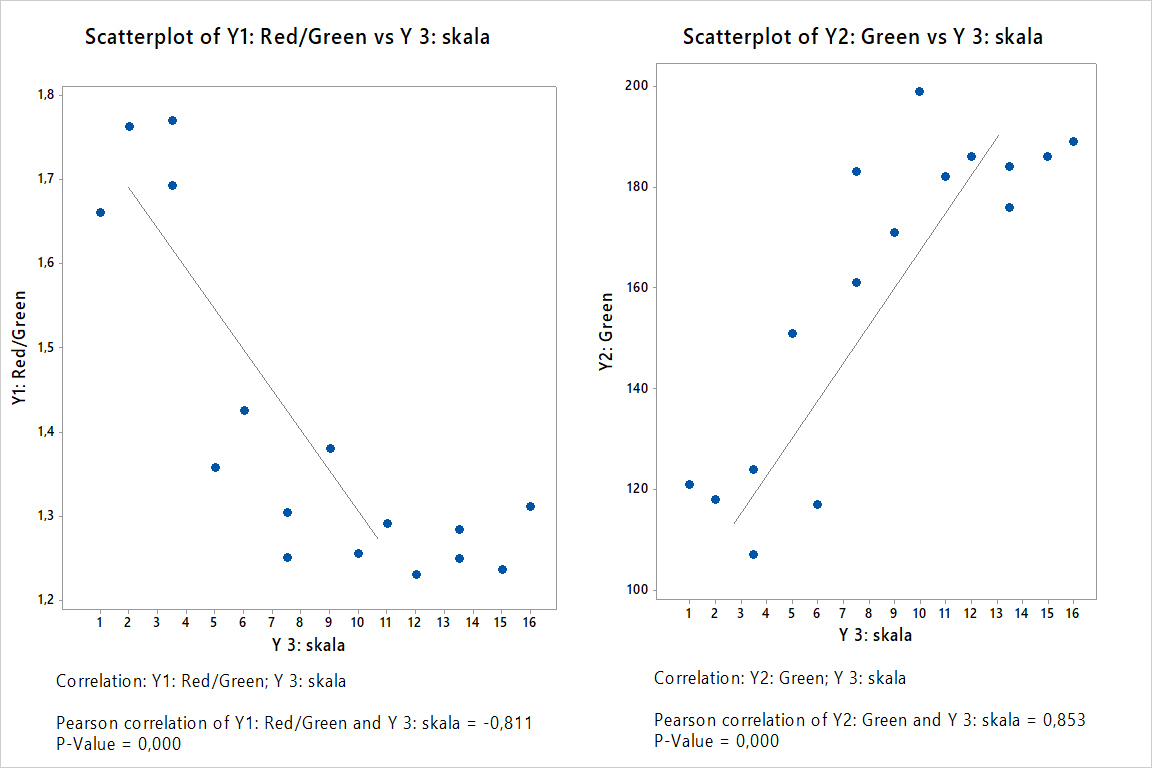 W naszym przypadku trzy Yki na różne sposoby opisują barwę żółtka. O ile korelacja Y1: Red/Green i Y2: Green jest oczywista, to ciekawe jest czy te Yki są skorelowane ze skalą, którą stworzyliśmy wizualnie porównując żółtka między sobą. Wykres poniżej pokazuje, że tak jest.