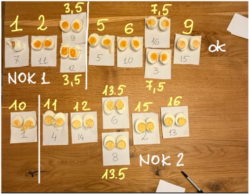 Jajka zostały przecięte i ułożone od najmniej ściętych (niedogotowanych nie tylko żółtek, ale nawet białek) przez idealne kremowe żółtka, po ewidentnie przegrzane z zieloną obwódką. Następnie nadaliśmy im kolejne numery i tak powstała skala, czyli Y3. Ponieważ jajek było 16, chcieliśmy je ponumerować od 1 do 16. W przypadku jajek, które były identyczne jak np.: nr 9 i 12, które w skali miałyby pozycję 3 i 4, do oceny obu zastosowaliśmy średnią z tych dwóch, czyli 3,5. Tą samą procedurę zastosowaliśmy do jajek nr 6 i 8.