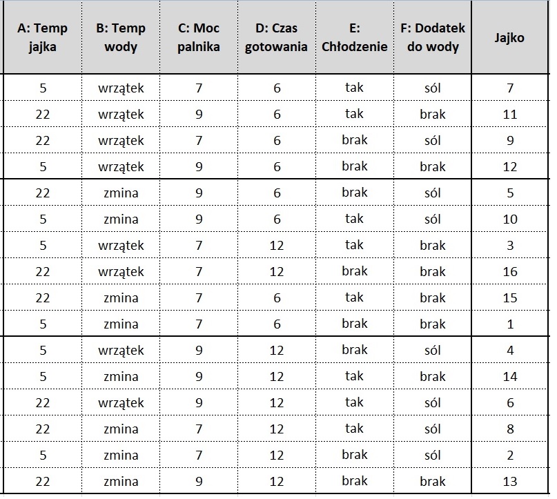 Eksperyment przeprowadziliśmy całkowicie losowo, zgodnie z wcześniej wykreowaną matrycą 26-2IV=16. Ugotowaliśmy w ten sposób 16 jajek. Numer jajka oznacza również kolejność gotowania i dokonywania pomiarów.