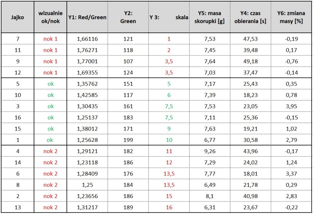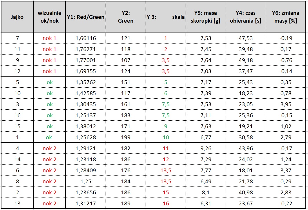 Aby skonfrontować skalę z pomiarem ciągłym, za pomocą specjalnej aplikacji, żółtka z kolejnych jajek zostały również zmierzone w skali RGB. Na tej podstawie określone zostaną Y1: Red/ Green, oraz Y2: Green, które jak Y3: skala, będą miarą jakości ugotowania żółtka.